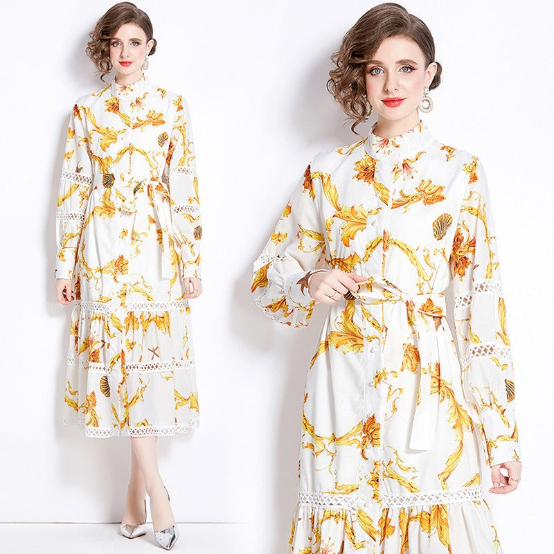 Fashionable Bohemian stand up collar lantern sleeves with waistband design, long printed dress