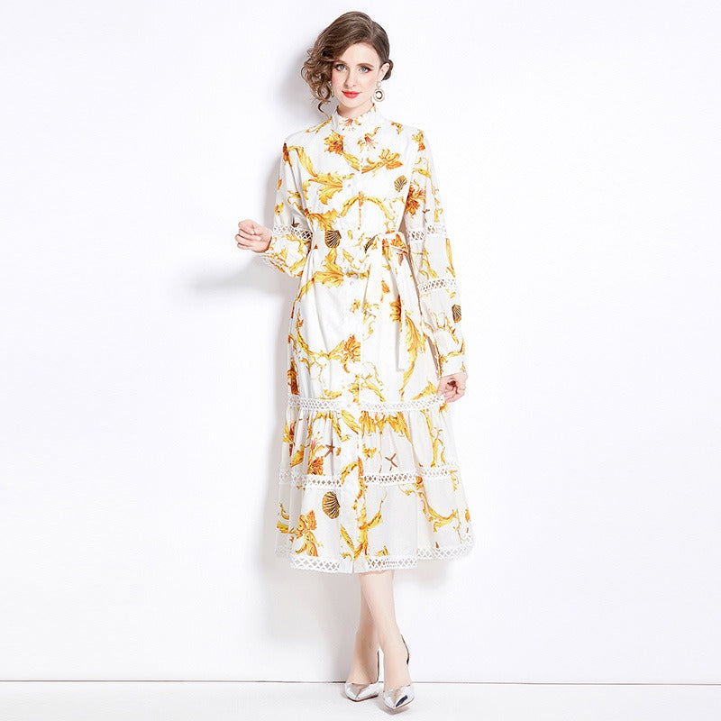 Fashionable Bohemian stand up collar lantern sleeves with waistband design, long printed dress