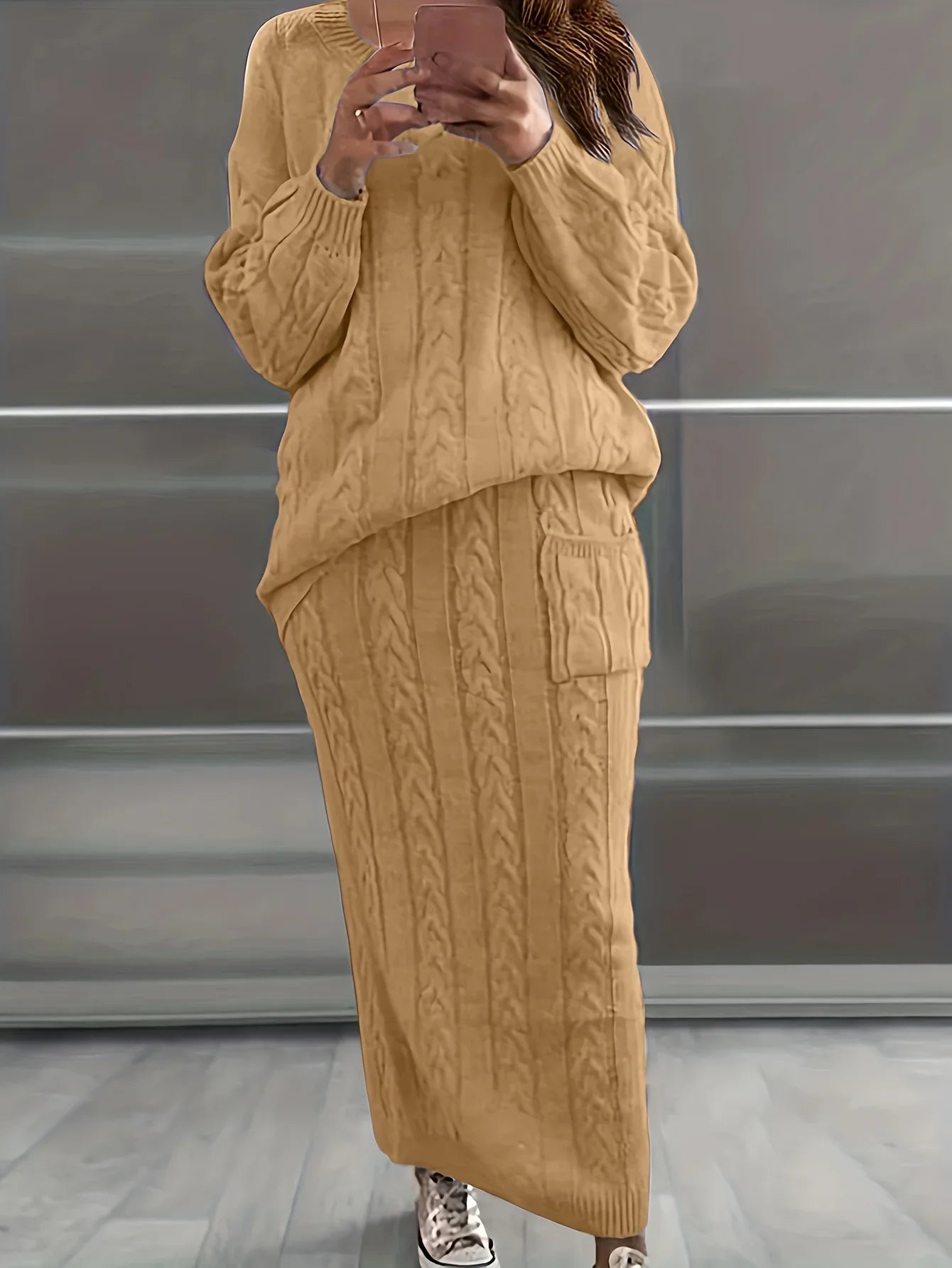 Solid Knitted Two Piece Skirt and Sweater Set for Women