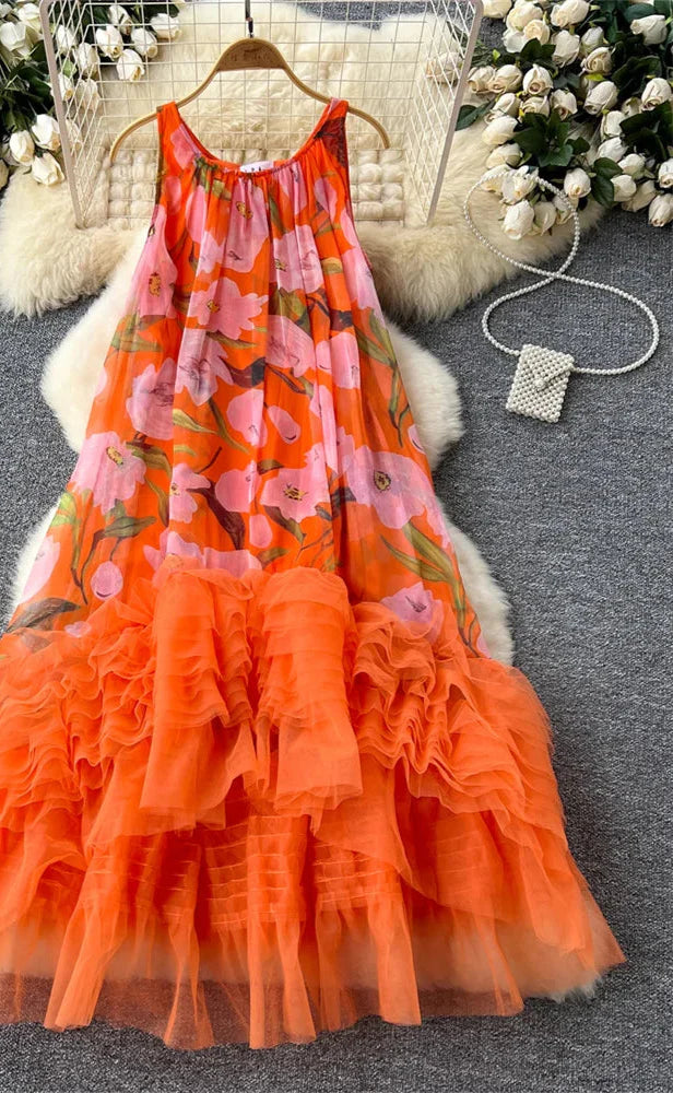French Vintage Floral Print Dress w/Tulle Embellishment